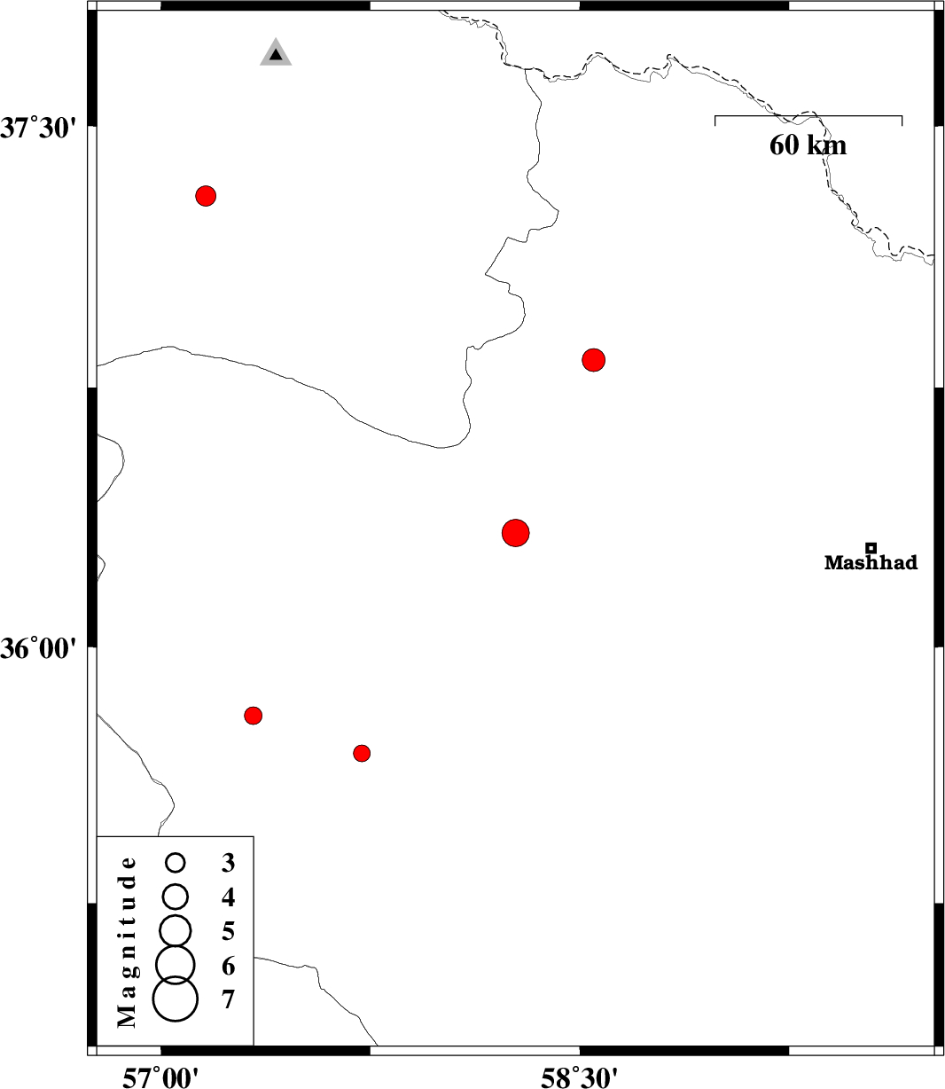 2014/01/02 | 13:31:52.8 | 17:01:52.8 | 36.83 | 58.55 | 15 | ML:3.6 | Khorasan(center) Province, 32 km South of Quchan | ||