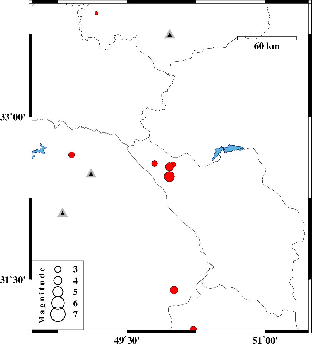 | 2014/01/29 | 15:48:50.5 | 19:18:50.5 | 32.54 | 49.96 | 15 | ML:3.9 | Chaharmahal Bakhtiari Province, 17 km West of Chelgard | ||