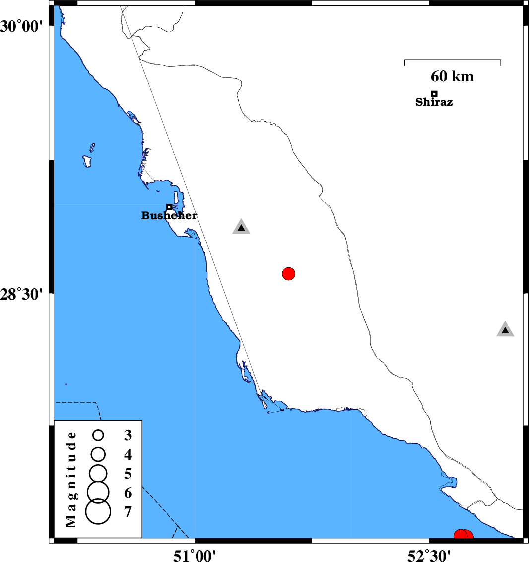 2014/02/02 | 10:29:05.1 | 13:59:05.1 | 27.11 | 52.73 | 15 | ML:4.8 | Persian Gulf, 51 km South-West of Mehr |