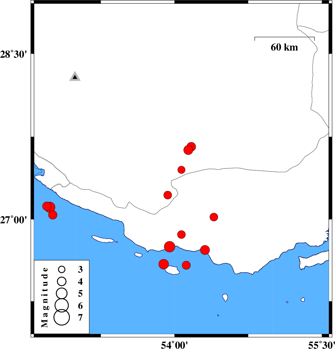 2014/01/10 | 14:30:39.3 | 18:00:39.3 | 26.58 | 54.12 | 15 | ML:3.8 | Persian Gulf, 73 km West of Bandar-e lengeh | ||