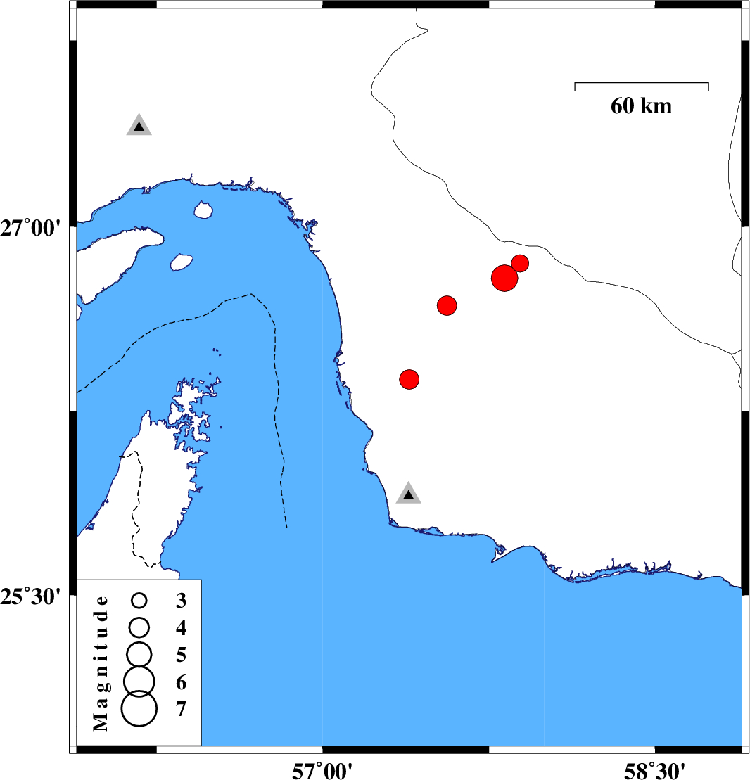 | 2014/02/02 | 14:26:44.5 | 17:56:44.5 | 26.79 | 57.82 | 15 | Mb:5.3 | Hormozgan Province, 76 km South-East of Manujan |