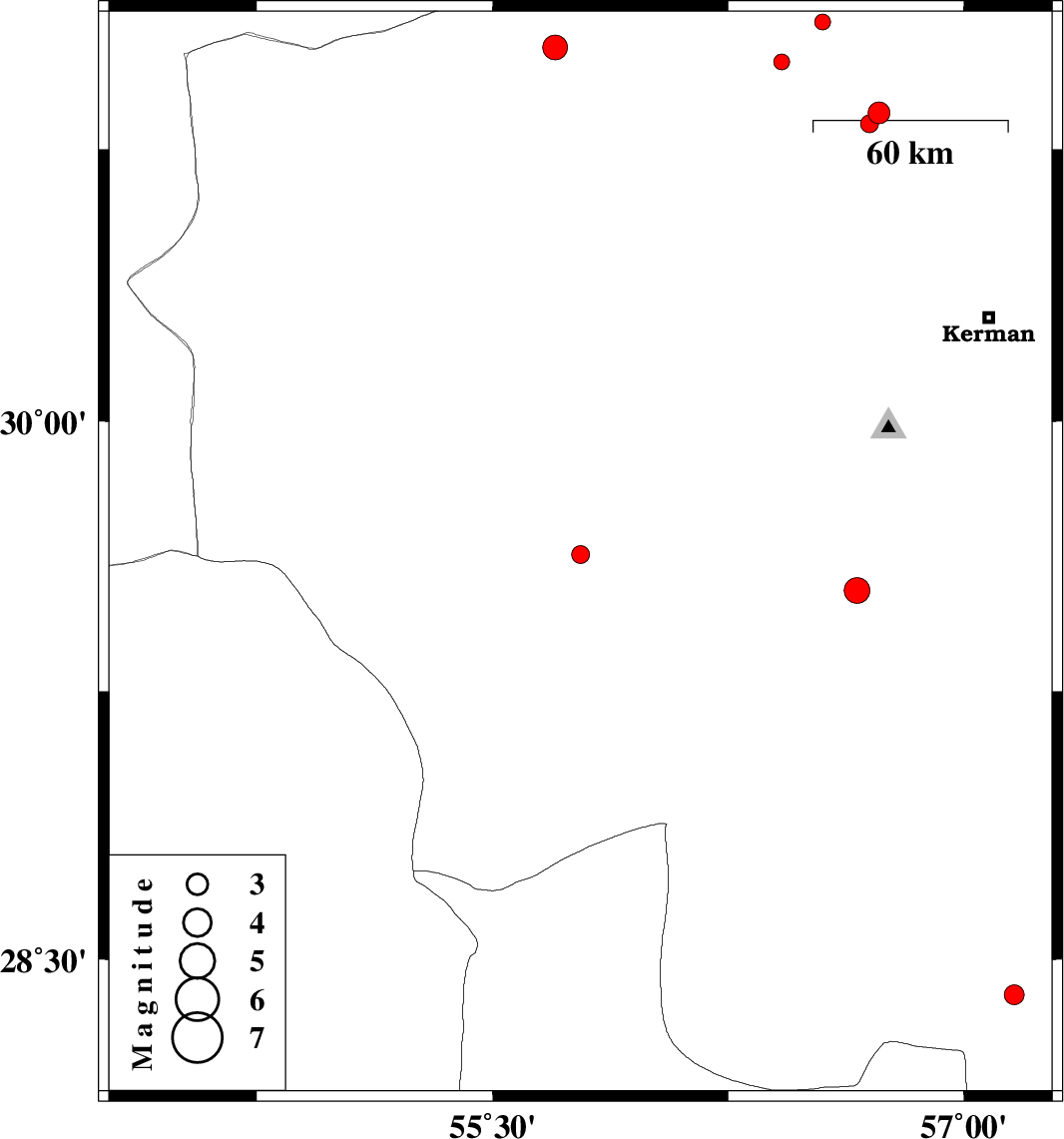 2014/01/30 | 13:23:54.4 | 16:53:54.4 | 30.99 | 56.42 | 14 | ML:2.3 | Kerman Province, 25 km North-West of Zarand | ||