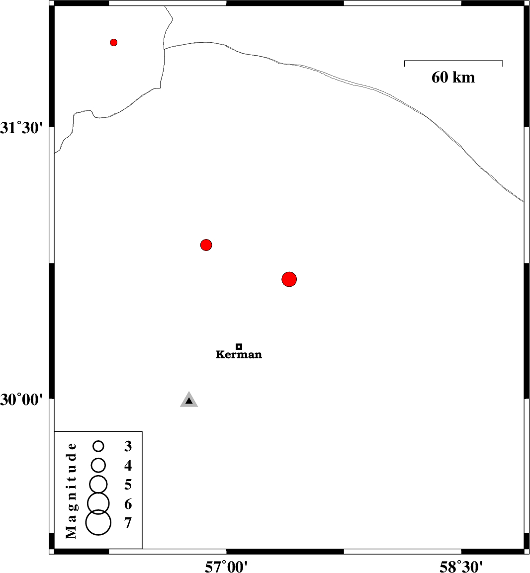 2014/02/15 | 18:57:22.6 | 22:27:22.6 | 30.66 | 57.4 | 14 | ML:4.2 | Kerman Province, 51 km North-East of Kerman | ||