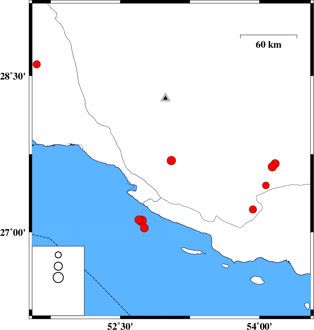 2014/02/03 | 05:33:57.6 | 09:03:57.6 | 27.12 | 52.7 | 15 | ML:3.9 | Persian Gulf, 51 km South-West of Mehr | ||