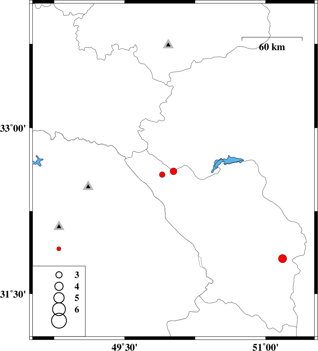 2014/02/17 | 13:34:01.5 | 17:04:01.5 | 32.61 | 50.02 | 14 | ML:3.3 | Chaharmahal Bakhtiari Province, 18 km North-West of Chelgard | ||