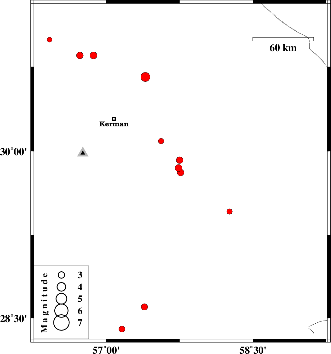 2014/02/21 | 22:57:01.7 | 02:27:01.7 | 29.92 | 57.75 | 35 | ML:3.1 | Kerman Province, 76 km South-East of Kerman | ||