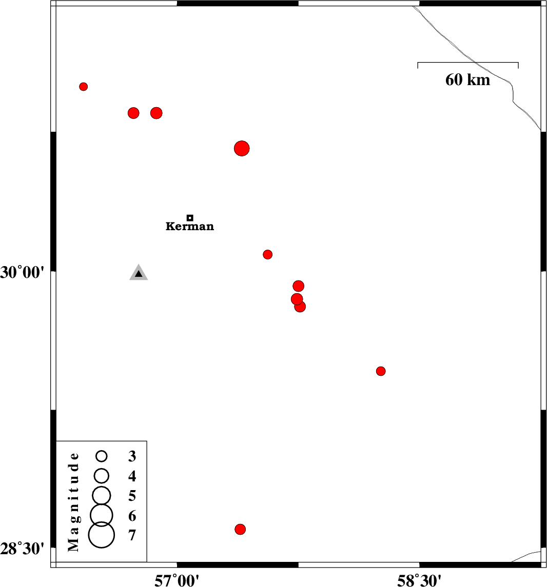 2014/02/21 | 11:14:59.6 | 14:44:59.6 | 29.85 | 57.74 | 42 | ML:3.2 | Kerman Province, 80 km South-East of Kerman | ||