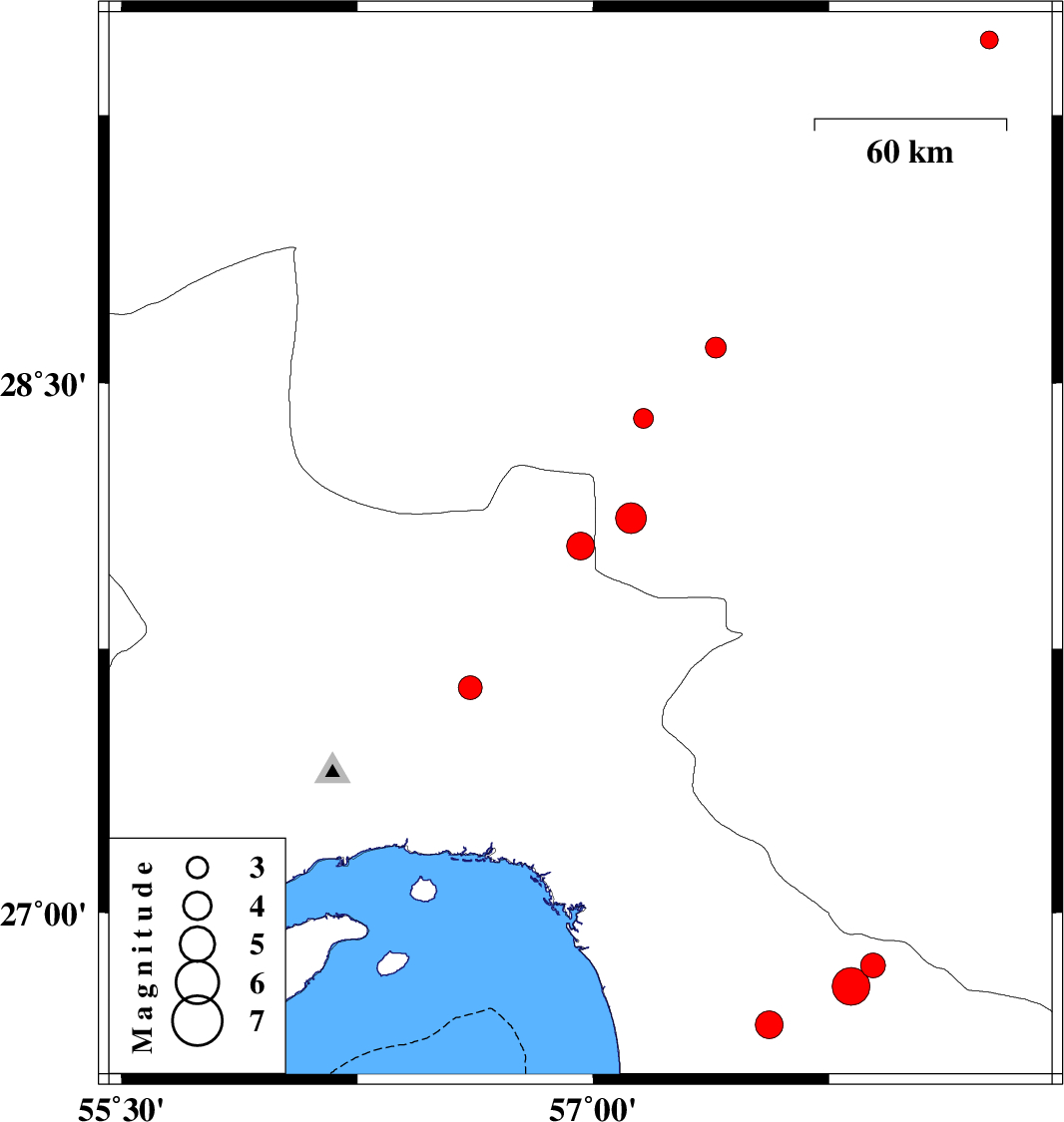 2014/01/27 | 13:40:54.8 | 17:10:54.8 | 27.64 | 56.61 | 18 | ML:3.4 | Hormozgan Province, 60 km North-East of Bandar-e abbas | ||