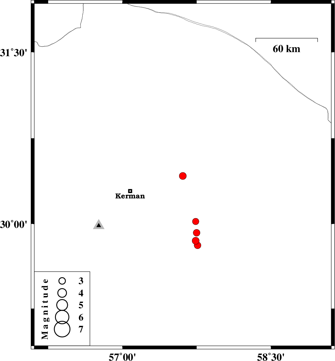 2014/02/21 | 11:14:59.6 | 14:44:59.6 | 29.85 | 57.74 | 42 | ML:3.2 | Kerman Province, 80 km South-East of Kerman | ||