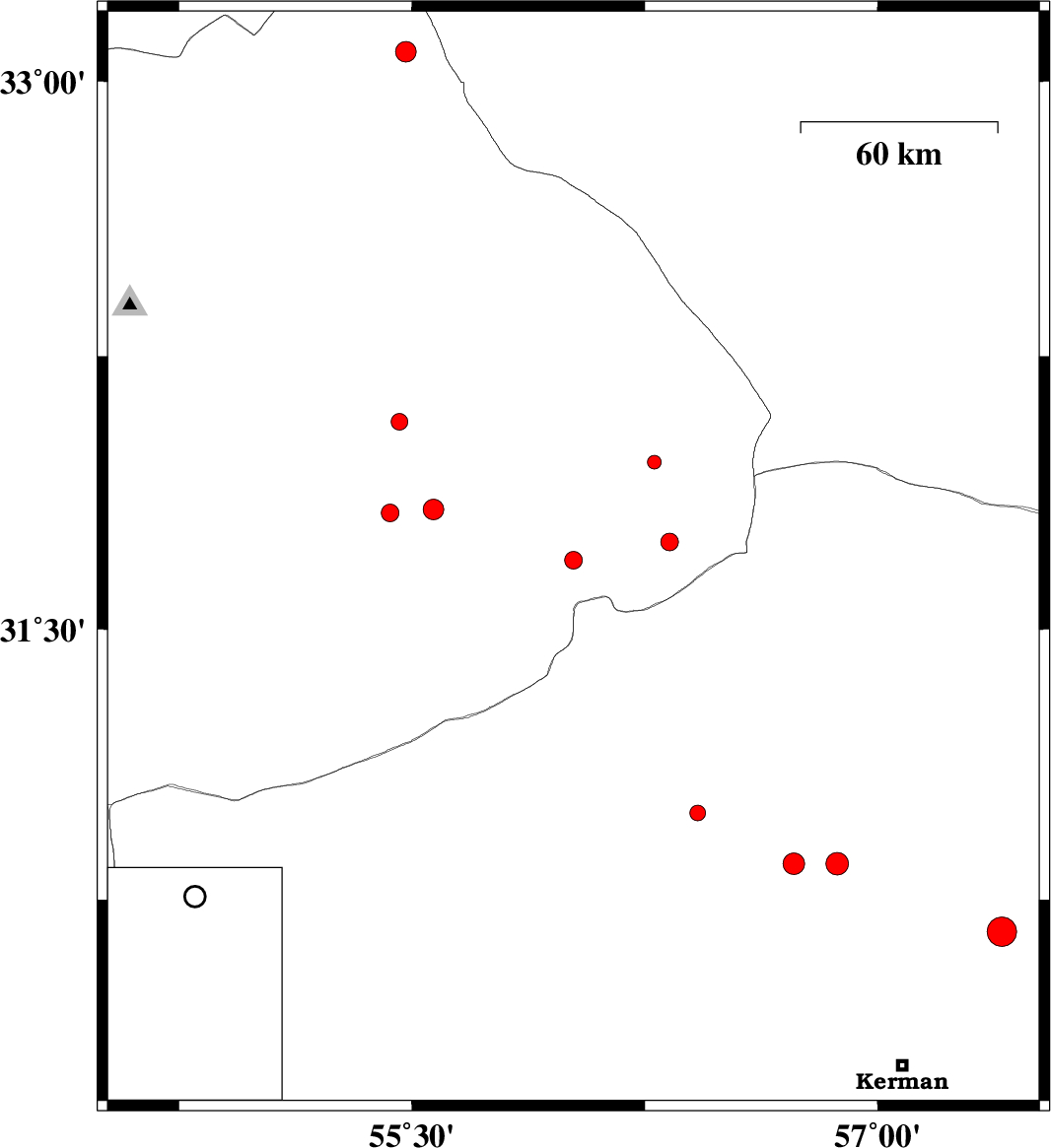2014/01/30 | 13:23:54.4 | 16:53:54.4 | 30.99 | 56.42 | 14 | ML:2.3 | Kerman Province, 25 km North-West of Zarand | ||