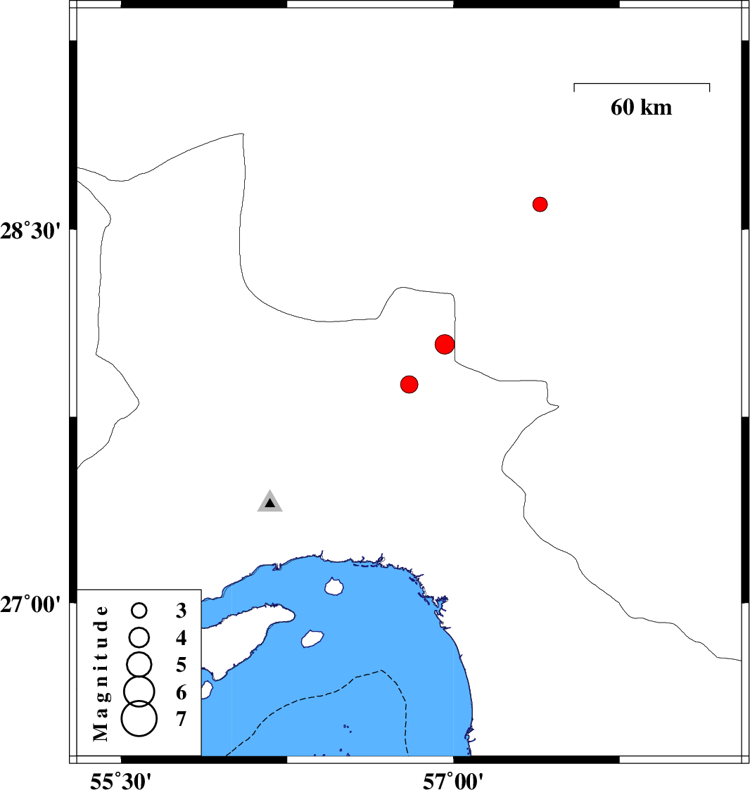 2014/02/25 | 19:14:22.8 | 22:44:22.8 | 27.88 | 56.8 | 18 | ML:3.5 | Hormozgan Province, 67 km North-West of Dehbarez | ||