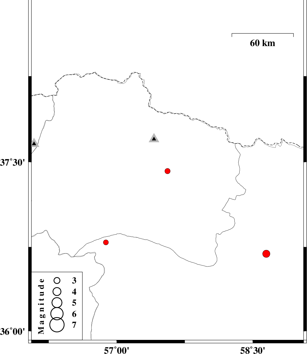 2014/03/05 | 05:29:58.0 | 08:59:58.0 | 36.79 | 56.88 | 14 | ML:2.6 | Khorasan(center) Province, 47 km South-East of Jajarm |