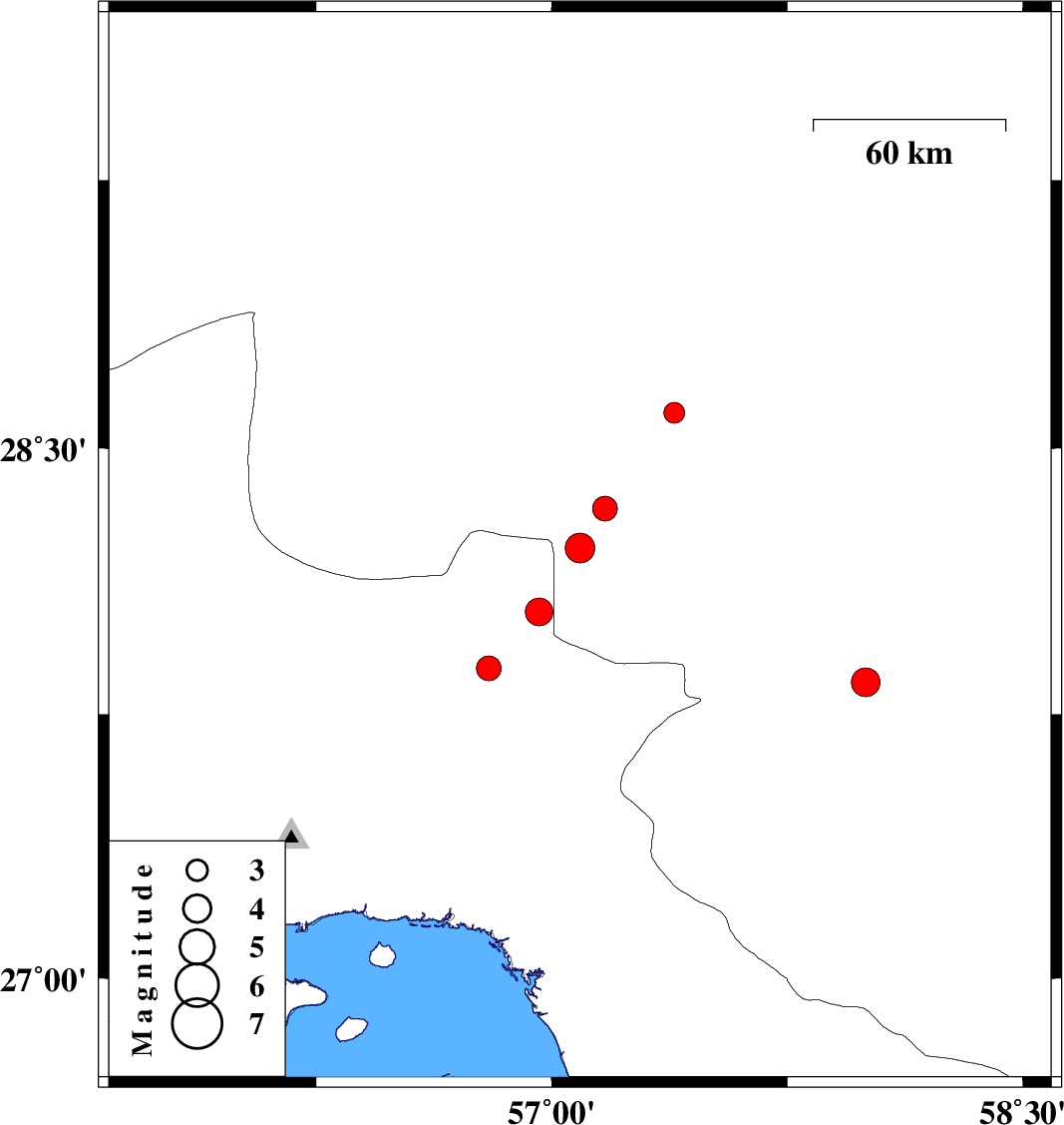2014/02/26 | 08:08:05.6 | 11:38:05.6 | 27.84 | 58 | 43 | ML:4.1 | Kerman Province, 33 km South-East of Kahnuj | ||
