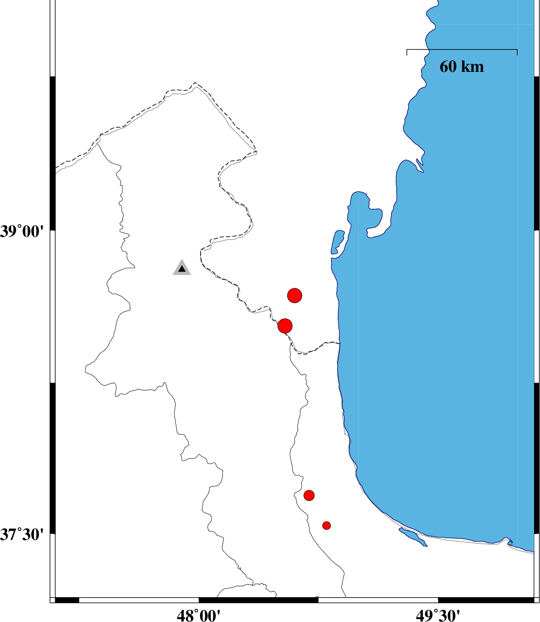 2014/03/15 | 02:20:53.7 | 05:50:53.7 | 38.68 | 48.6 | 14 | ML:4.1 | Azerbaijan, 30 km North-East of Namin | ||