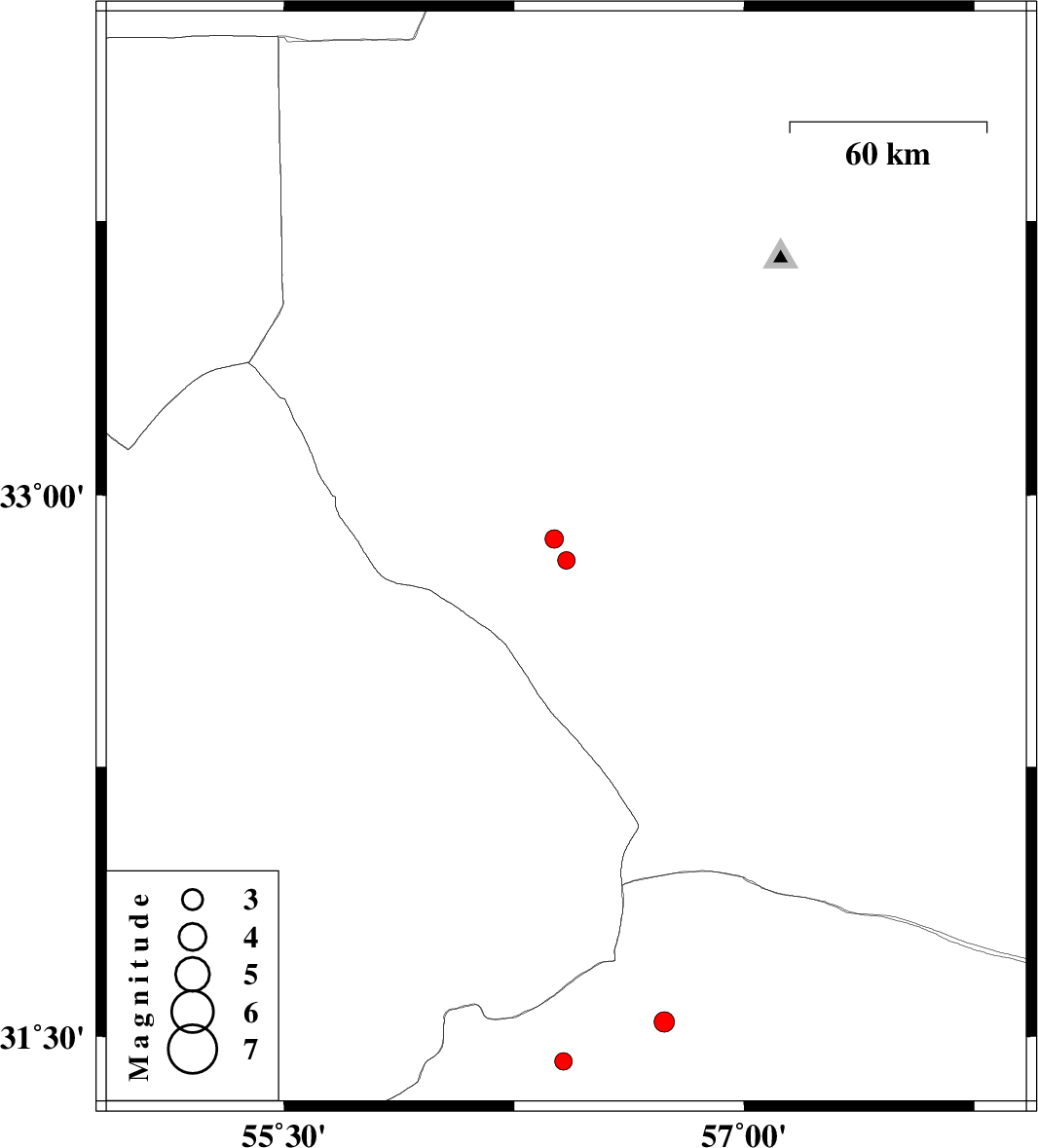 | 2014/03/17 | 06:01:14.3 | 09:31:14.3 | 32.82 | 56.42 | 15 | ML:2.6 | Yazd Province, 98 km South-West of Tabas | ||