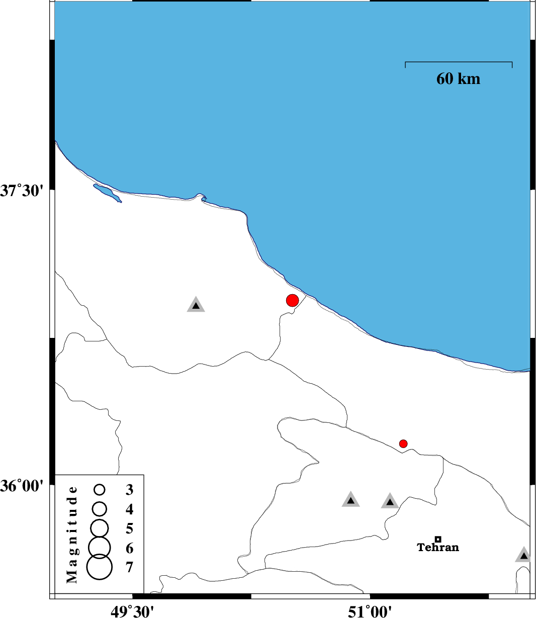 2014/03/20 | 11:13:22.5 | 14:43:22.5 | 36.94 | 50.51 | 31 | ML:3.5 | Gilan Province, 13 km West of Ramsar | ||
