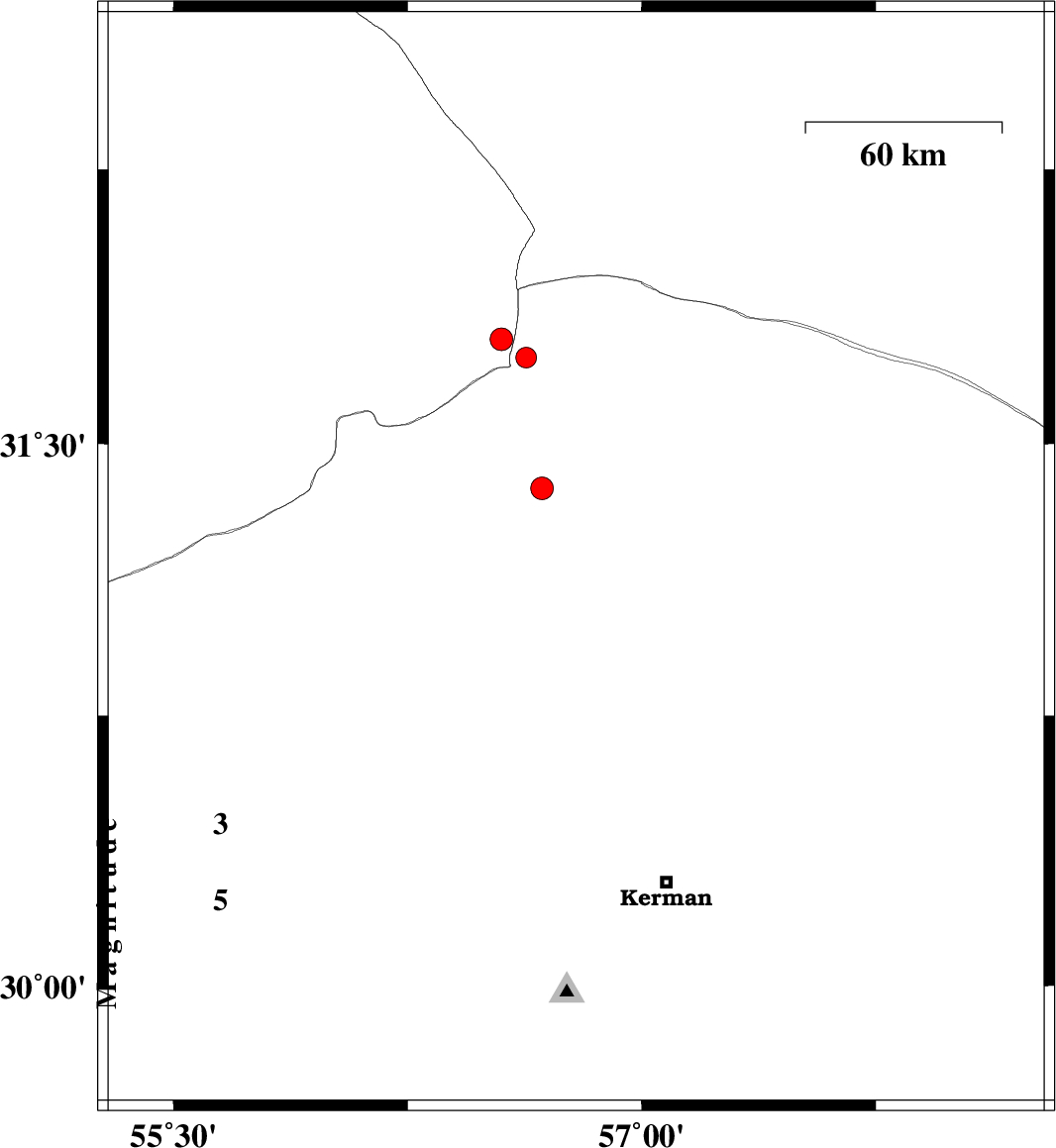 2014/03/14 | 08:04:35.4 | 11:34:35.4 | 31.54 | 56.74 | 15 | ML:2.9 | Kerman Province, 31 km North of Ravar |