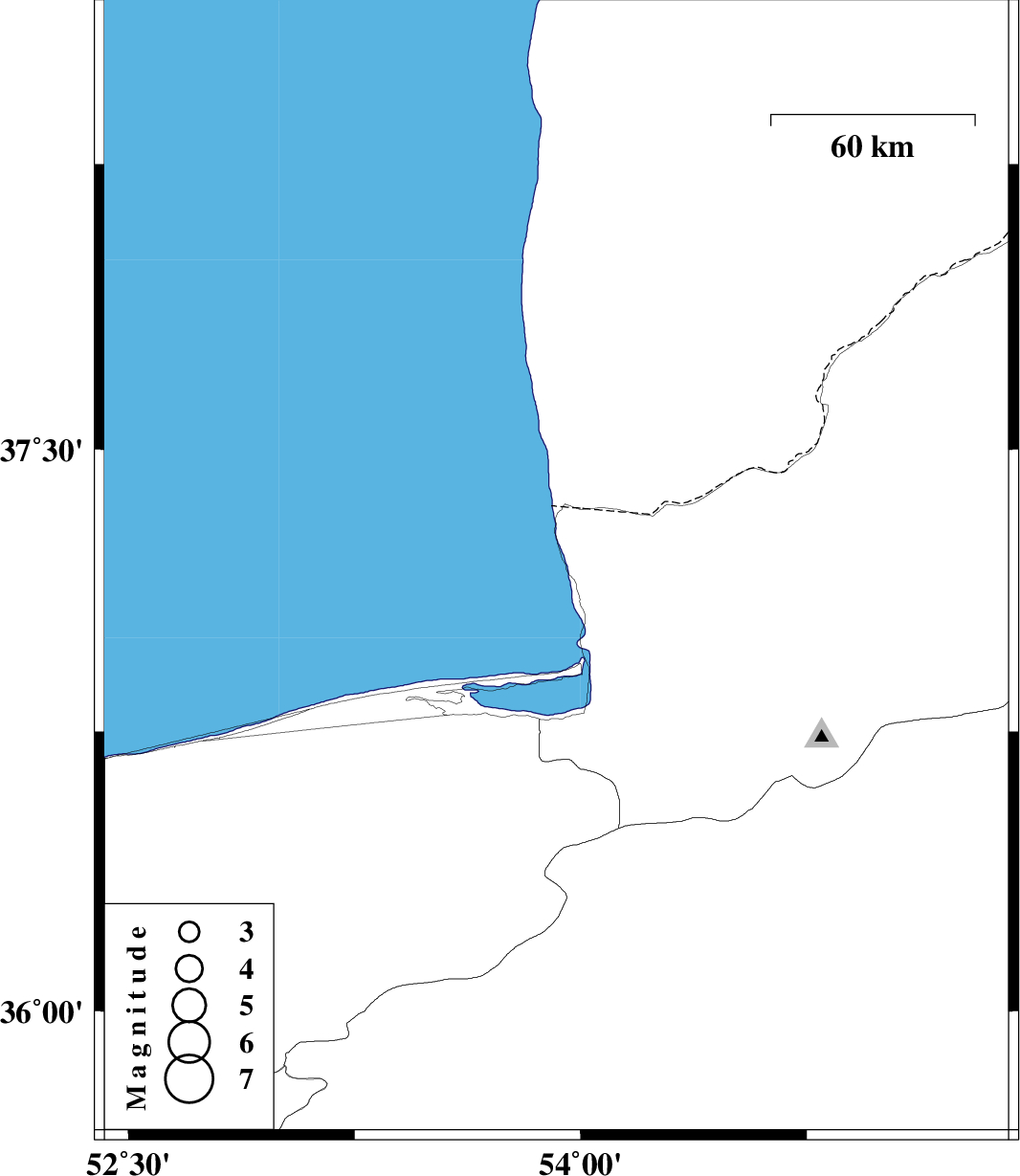 | 2014/03/24 | 04:11:20.5 | 08:41:20.5 | 37.18 | 53.92 | 15 | ML:2.5 | Caspian Sea, 34 km North-West of Bandar-e torkaman |