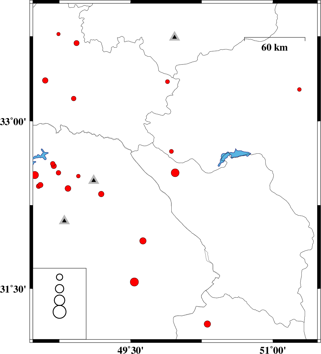 2014/03/02 | 05:50:20.6 | 09:20:20.6 | 33.69 | 48.93 | 15 | ML:2.6 | Lorestan Province, 27 km North-West of Dorud |