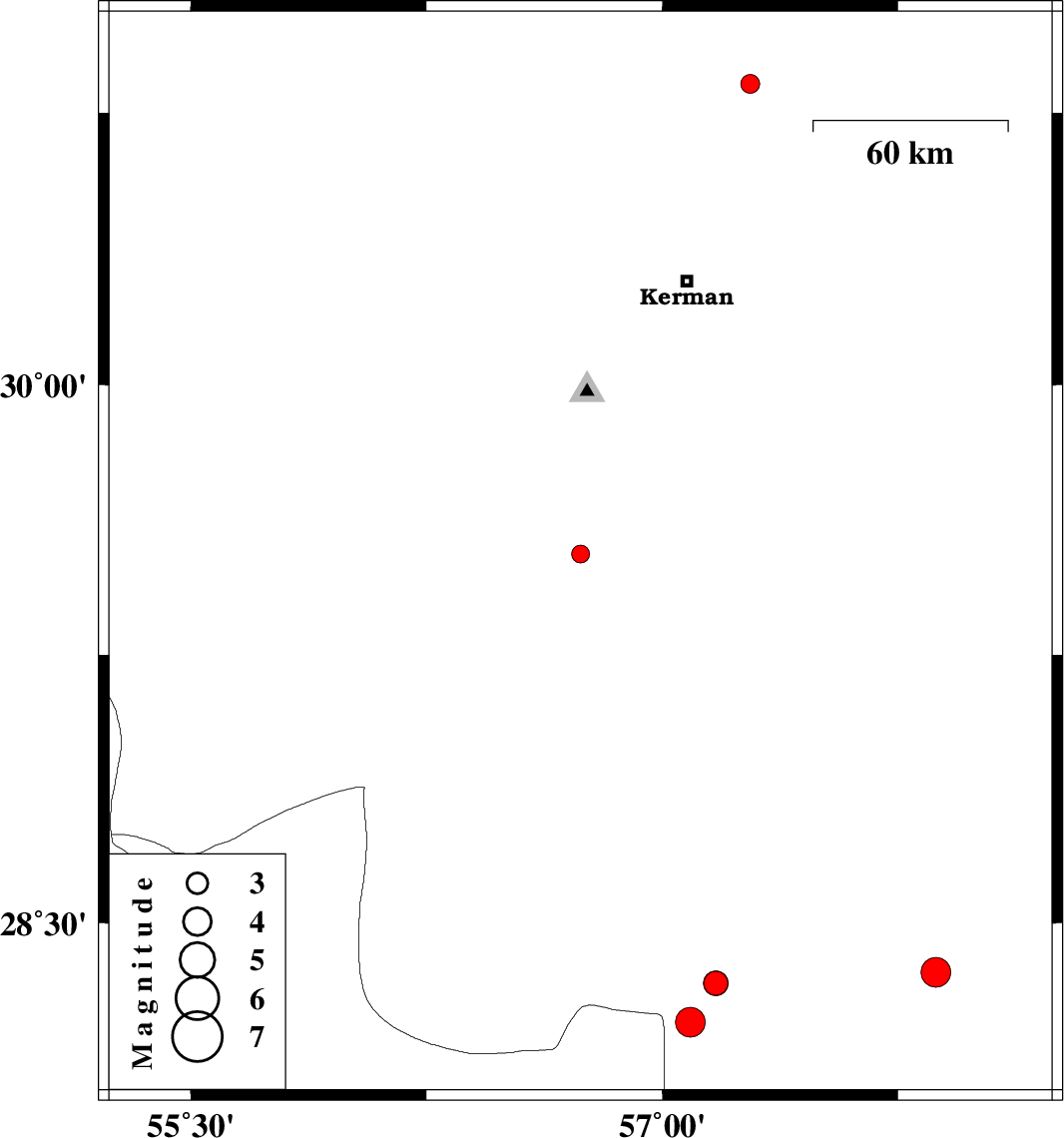 | 2014/03/02 | 04:11:56.8 | 07:41:56.8 | 28.33 | 57.17 | 14 | ML:3.5 | Kerman Province, 67 km North-West of Kahnuj |