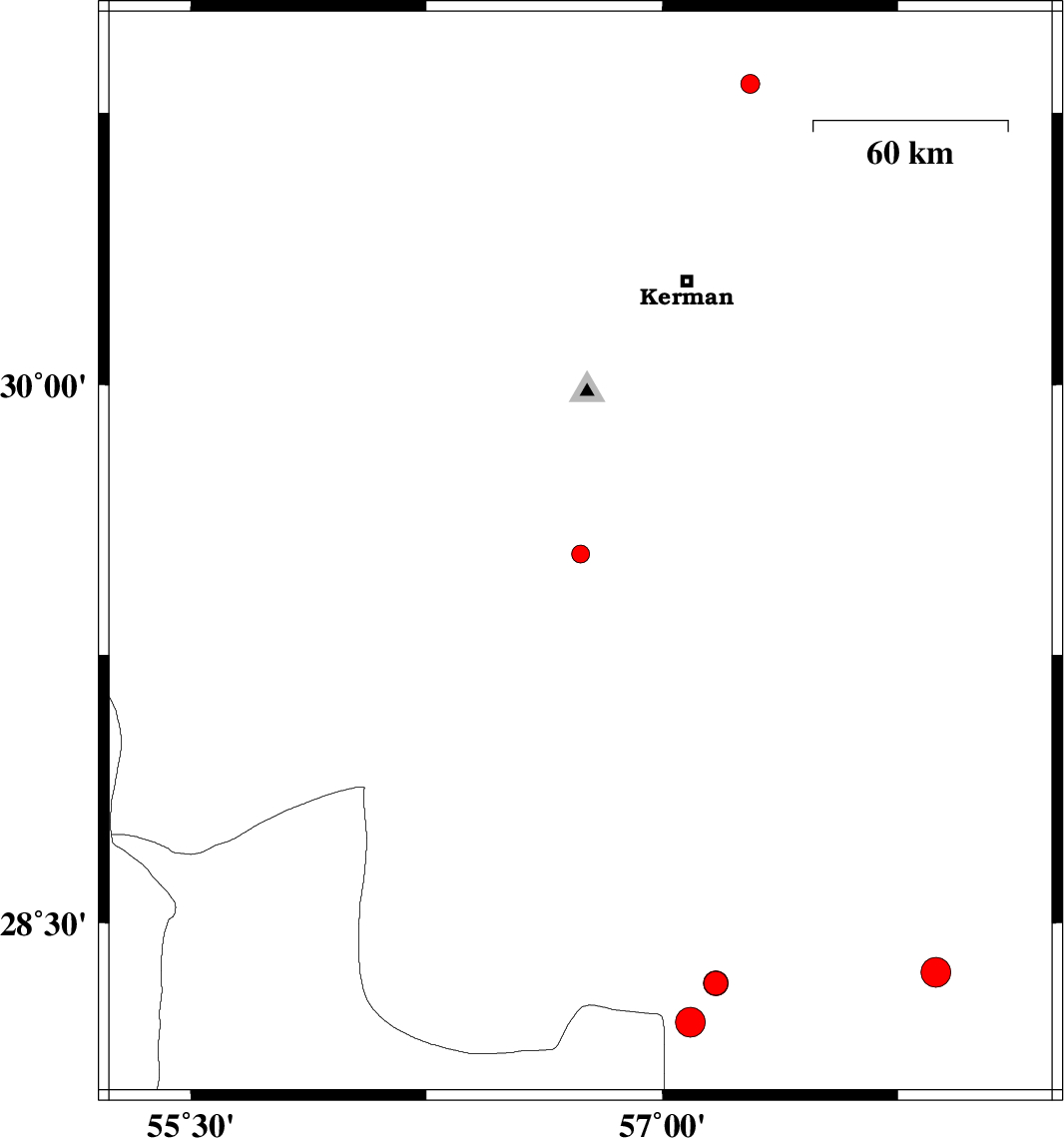 2014/03/02 | 04:11:56.8 | 07:41:56.8 | 28.33 | 57.17 | 14 | ML:3.5 | Kerman Province, 67 km North-West of Kahnuj |