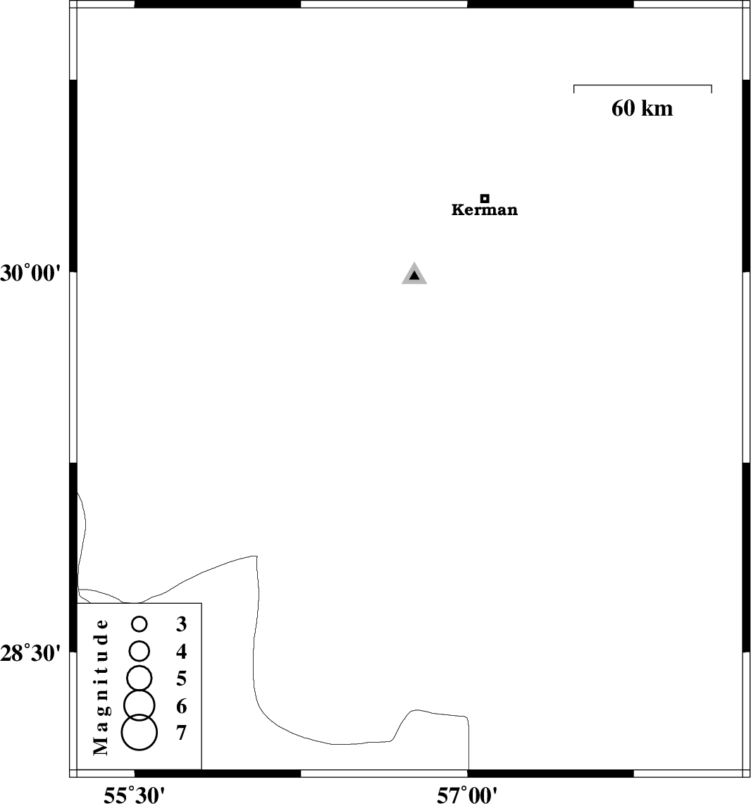 | 2014/03/30 | 06:45:38.8 | 11:15:38.8 | 29.53 | 56.74 | 12 | ML:2.5 | Kerman Province, 35 km North-East of Baft |