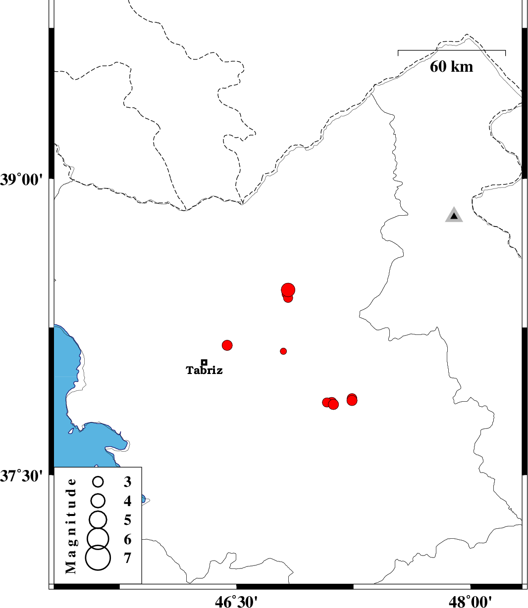 2014/03/09 | 06:34:10.8 | 10:04:10.8 | 38.16 | 46.44 | 14 | ML:3 | Azarbaijan Sharghi Province, 17 km East of Tabriz | ||