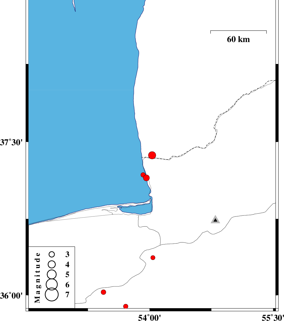 | 2014/03/31 | 11:02:07.3 | 15:32:07.3 | 37.15 | 53.96 | 18 | ML:3.4 | Caspian Sea, 29 km North-West of Bandar-e torkaman | ||