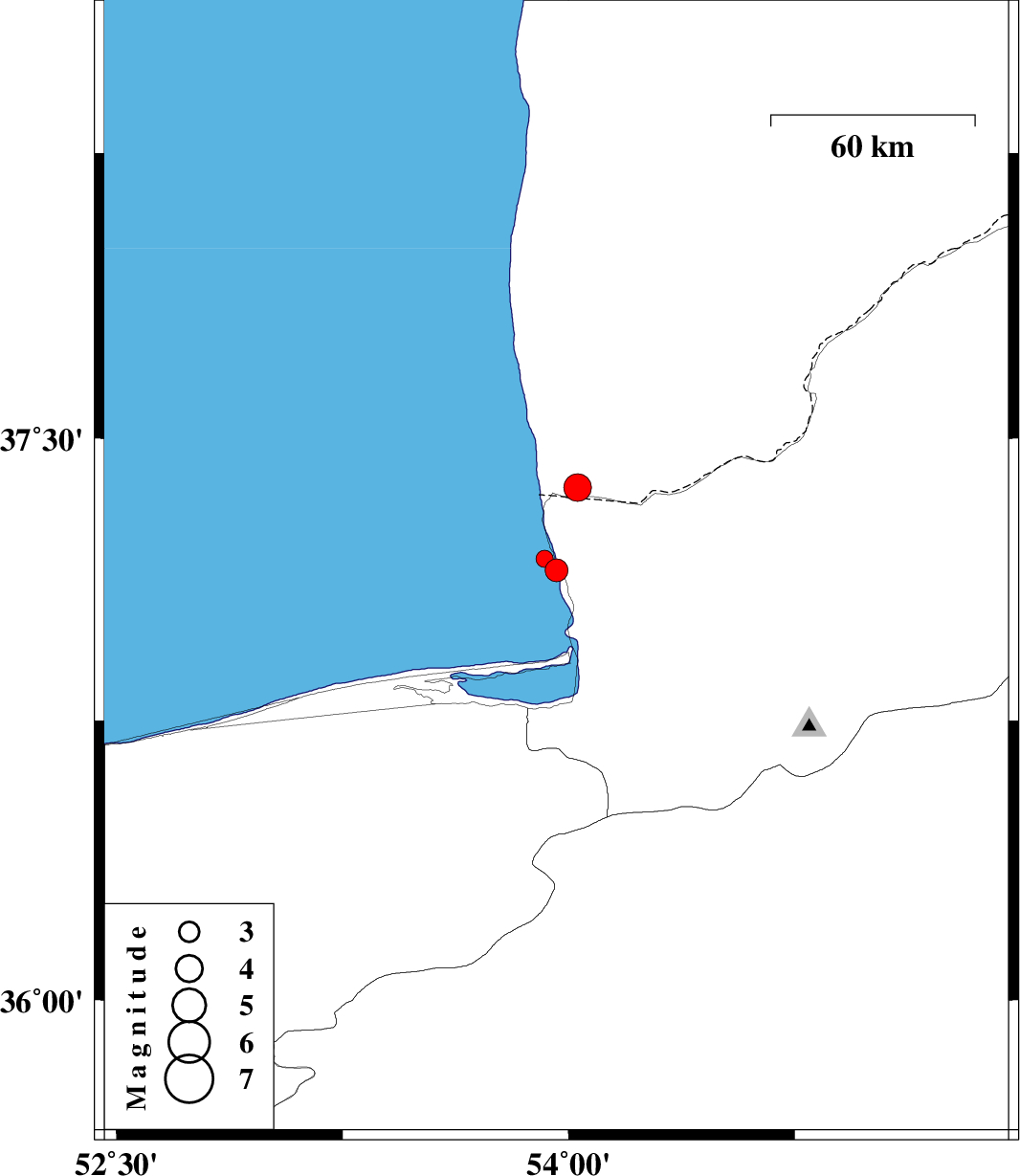2014/03/24 | 04:11:20.5 | 08:41:20.5 | 37.18 | 53.92 | 15 | ML:2.5 | Caspian Sea, 34 km North-West of Bandar-e torkaman |