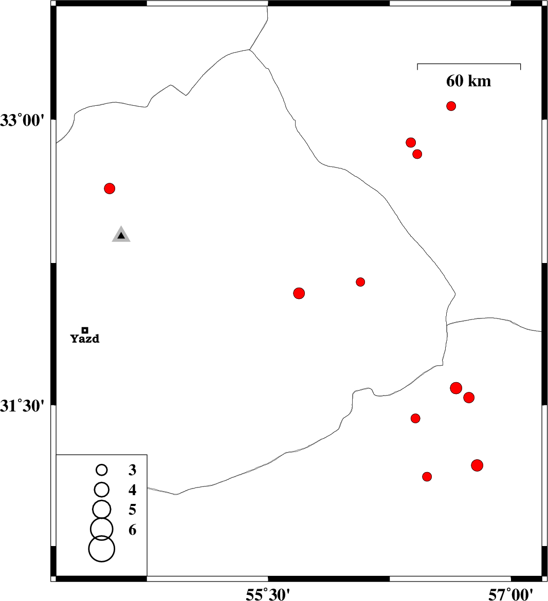 2014/03/03 | 07:09:34.4 | 10:39:34.4 | 33.07 | 56.63 | 15 | ML:2.5 | Yazd Province, 65 km South-West of Tabas |