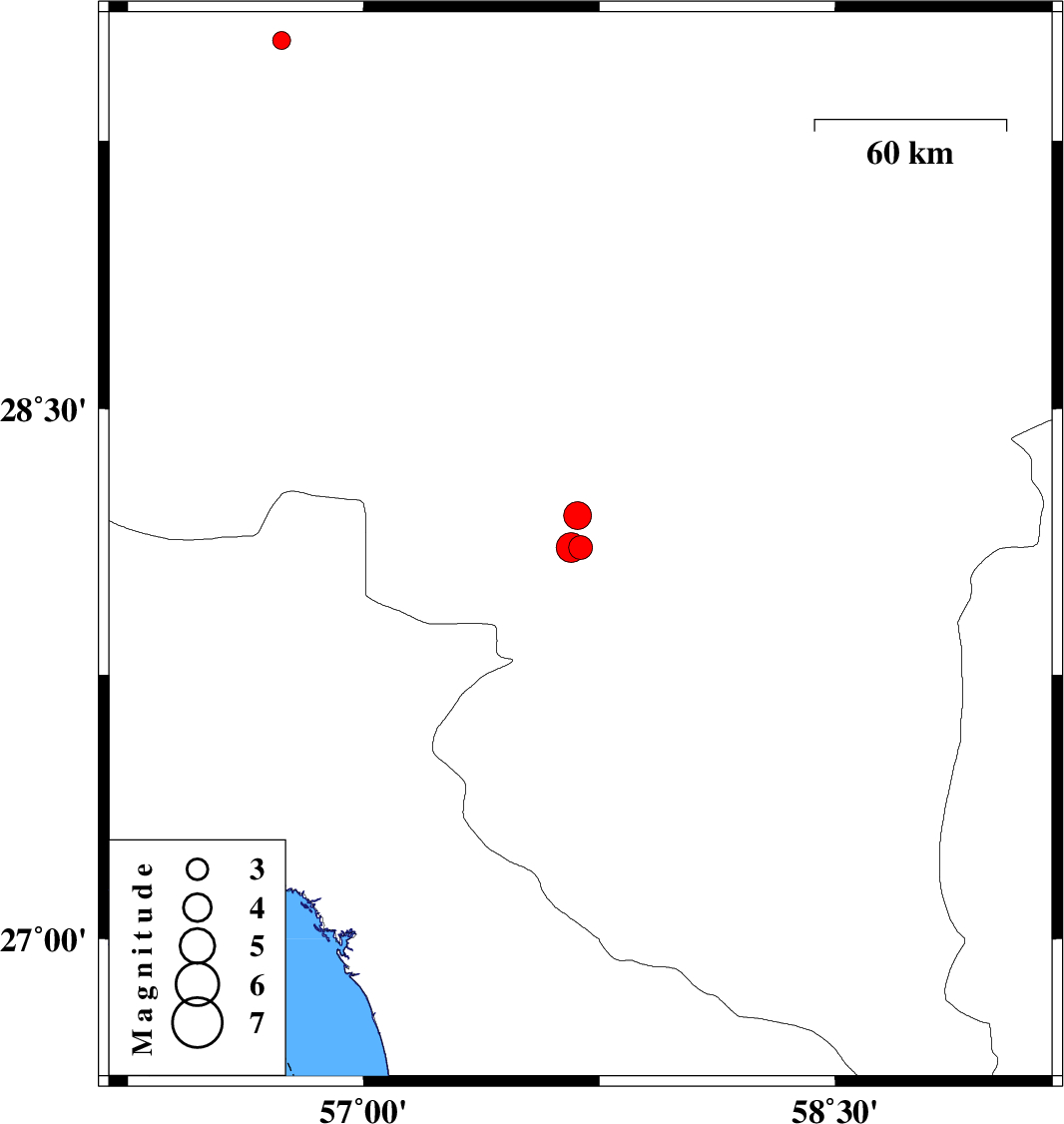 | 2014/04/01 | 09:58:15.6 | 14:28:15.6 | 28.11 | 57.69 | 15 | ML:3.4 | Kerman Province, 18 km North of Kahnuj | ||