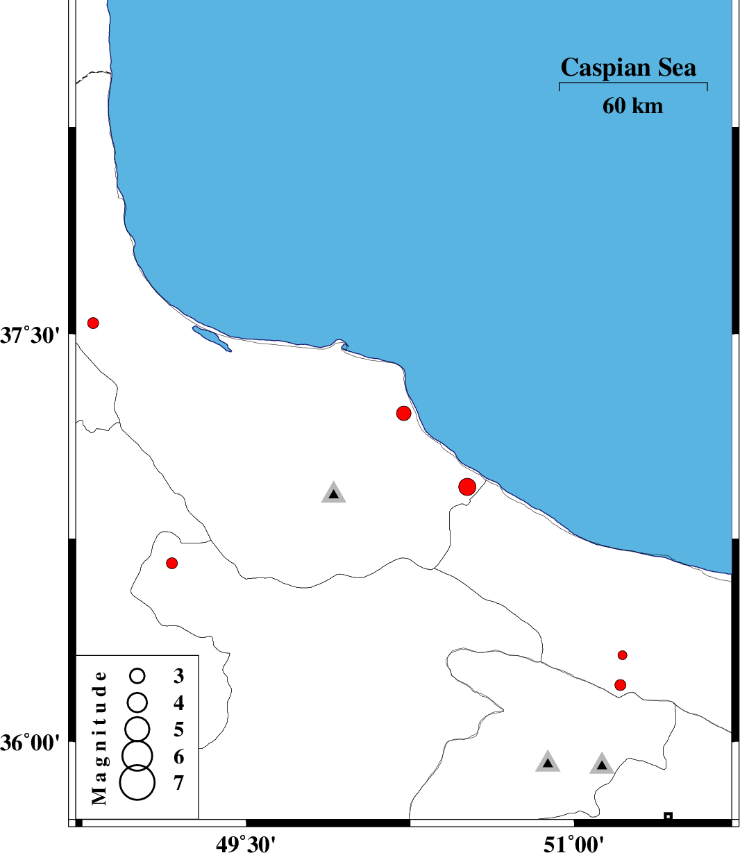 2014/03/20 | 11:13:22.5 | 14:43:22.5 | 36.94 | 50.51 | 31 | ML:3.5 | Gilan Province, 13 km West of Ramsar | ||