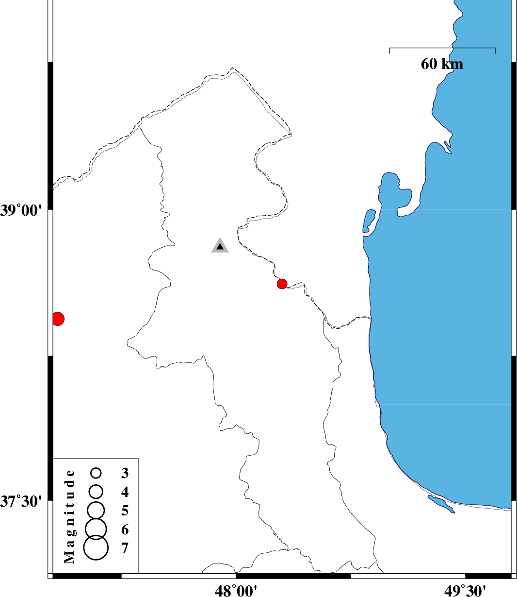 2014/04/04 | 23:35:25.7 | 04:05:25.7 | 38.62 | 48.3 | 30 | ML:2.9 | Ardebil Province, 24 km North-West of Namin | ||