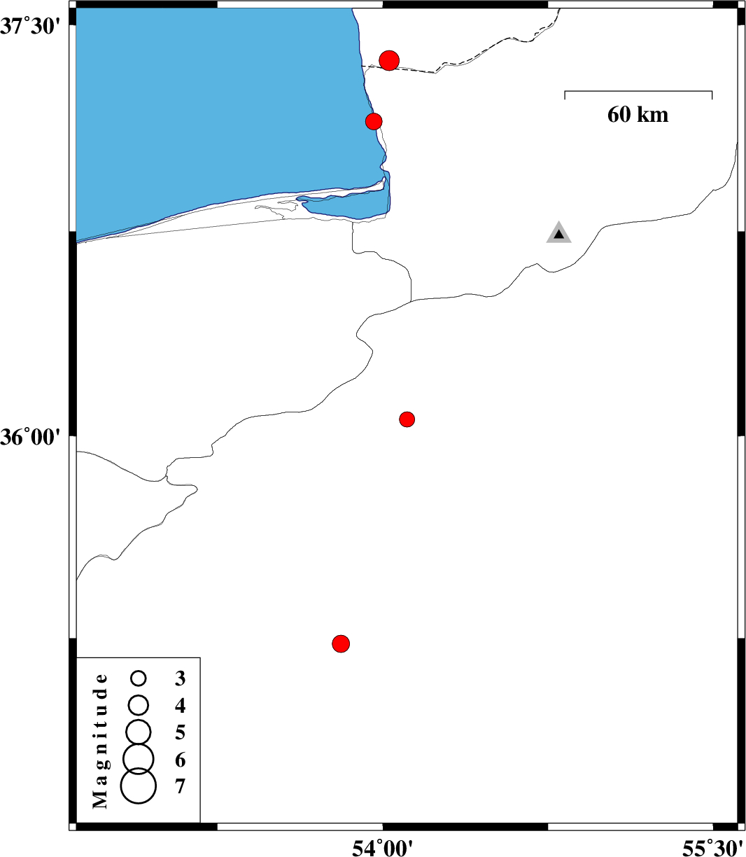 2014/03/31 | 11:02:07.3 | 15:32:07.3 | 37.15 | 53.96 | 18 | ML:3.4 | Caspian Sea, 29 km North-West of Bandar-e torkaman |