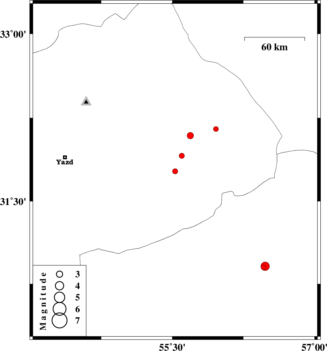 | 2014/03/31 | 21:52:52.0 | 02:22:52.0 | 32.09 | 55.69 | 14 | ML:3.1 | Yazd Province, 60 km North-East of Bafq |