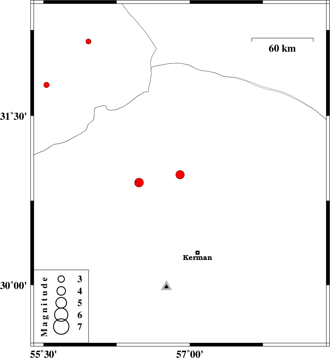 | 2014/04/11 | 23:36:13.3 | 04:06:13.3 | 30.98 | 56.9 | 14 | ML:4 | Kerman Province, 33 km South of Ravar | ||