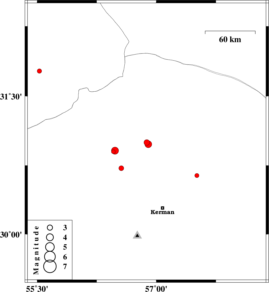 | 2014/04/11 | 23:36:13.3 | 04:06:13.3 | 30.98 | 56.9 | 14 | ML:4 | Kerman Province, 33 km South of Ravar | ||
