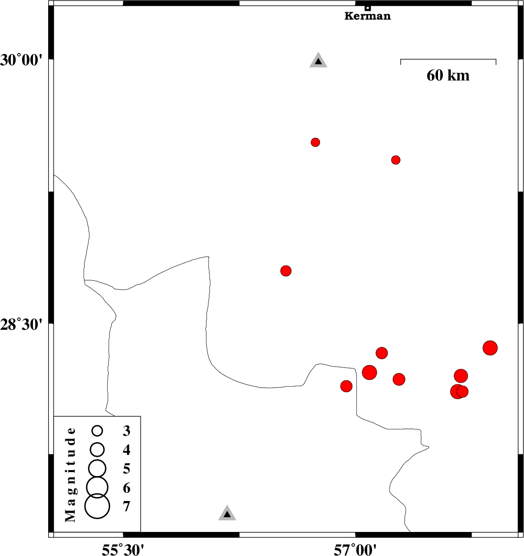 2014/03/12 | 20:22:00.5 | 23:52:00.5 | 28.22 | 57.09 | 14 | ML:4.3 | Kerman Province, 67 km North-West of Kahnuj |
