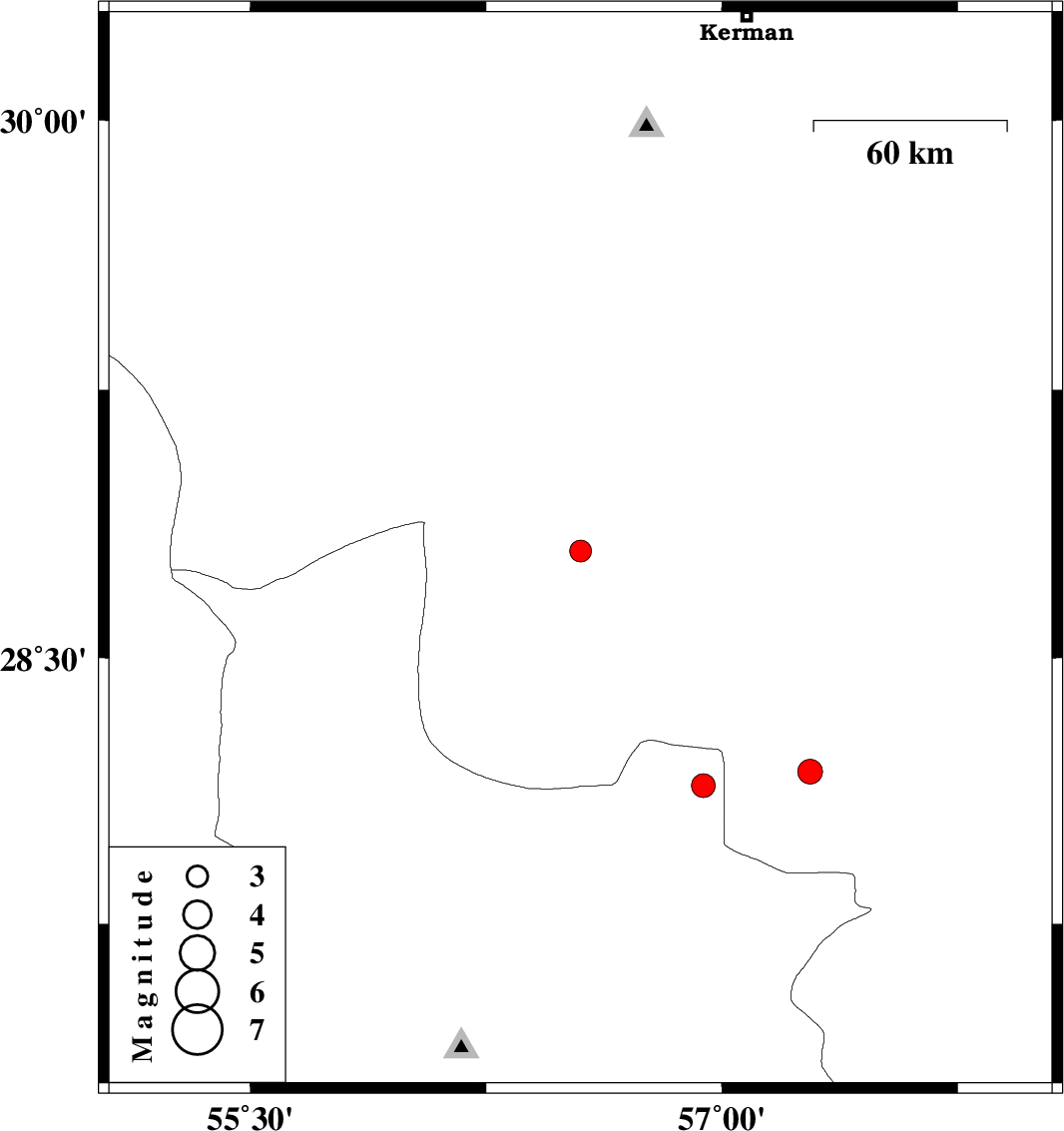 2014/04/04 | 03:46:10.0 | 08:16:10.0 | 28.18 | 57.28 | 14 | ML:3.5 | Kerman Province, 48 km North-West of Kahnuj |