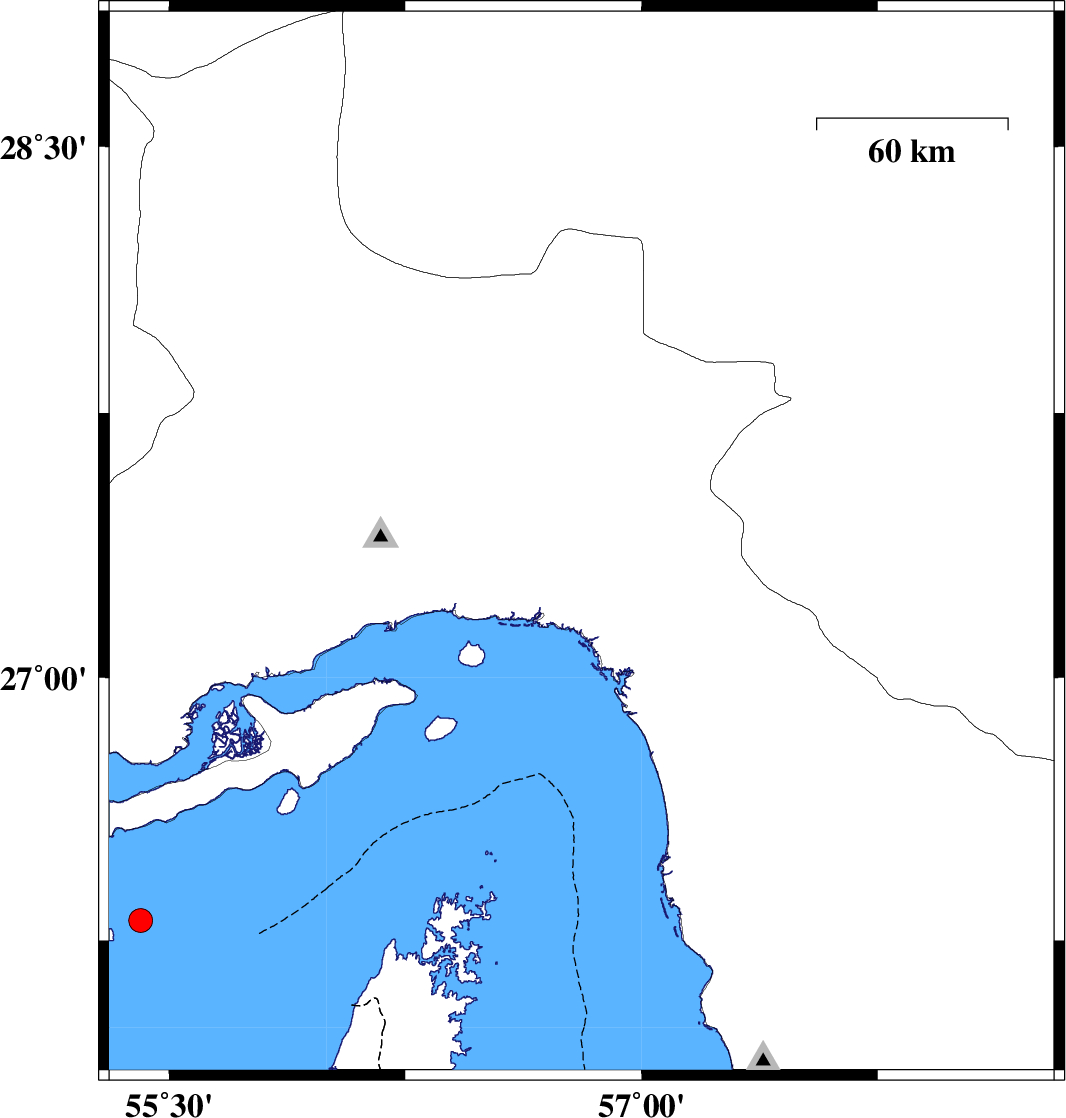 2014/04/12 | 06:02:18.9 | 10:32:18.9 | 27.38 | 56.81 | 15 | ML:3.3 | Hormozgan Province, 43 km West of Dehbarez | ||
