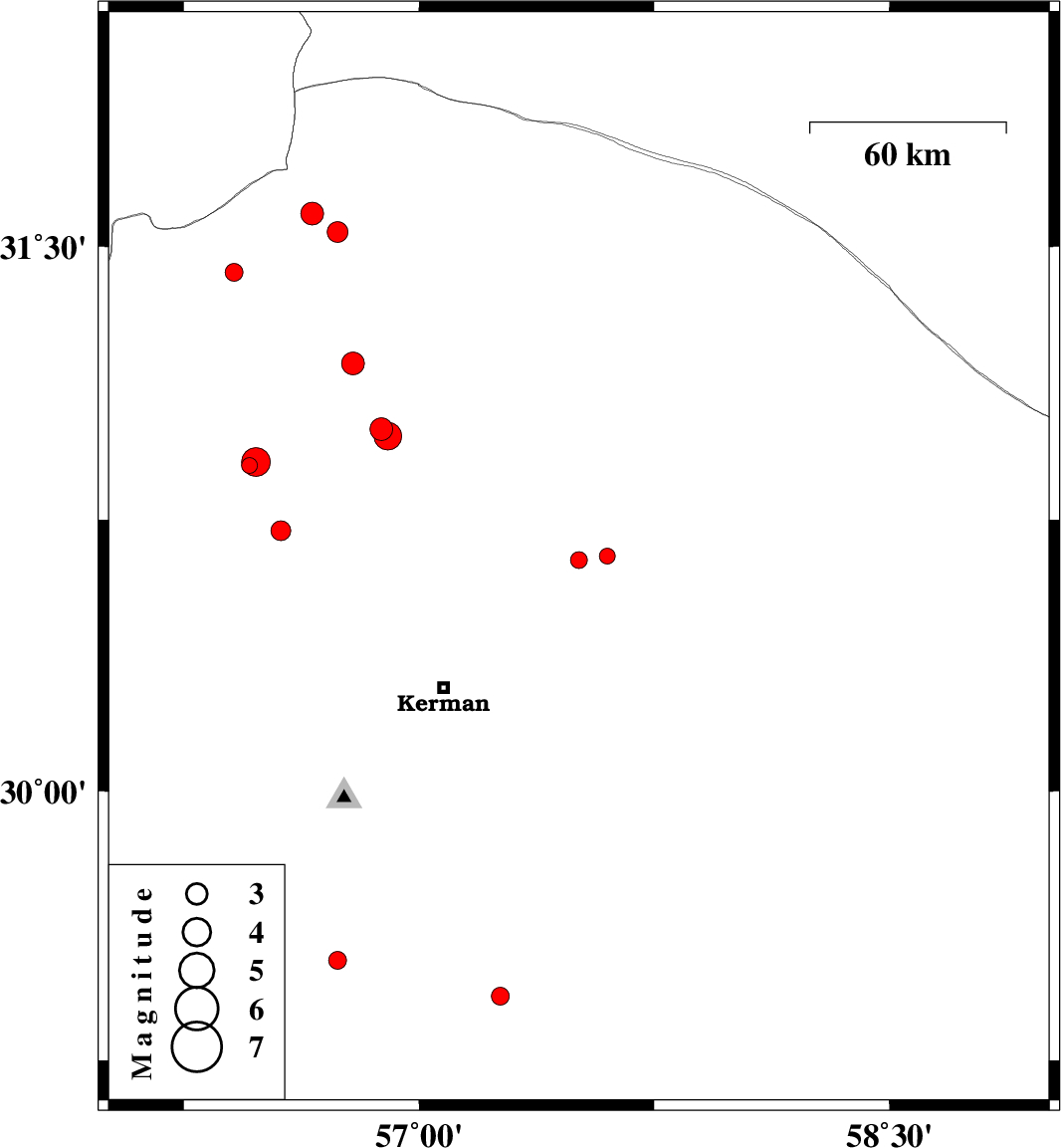 2014/04/11 | 23:36:13.3 | 04:06:13.3 | 30.98 | 56.9 | 14 | ML:4 | Kerman Province, 33 km South of Ravar | ||