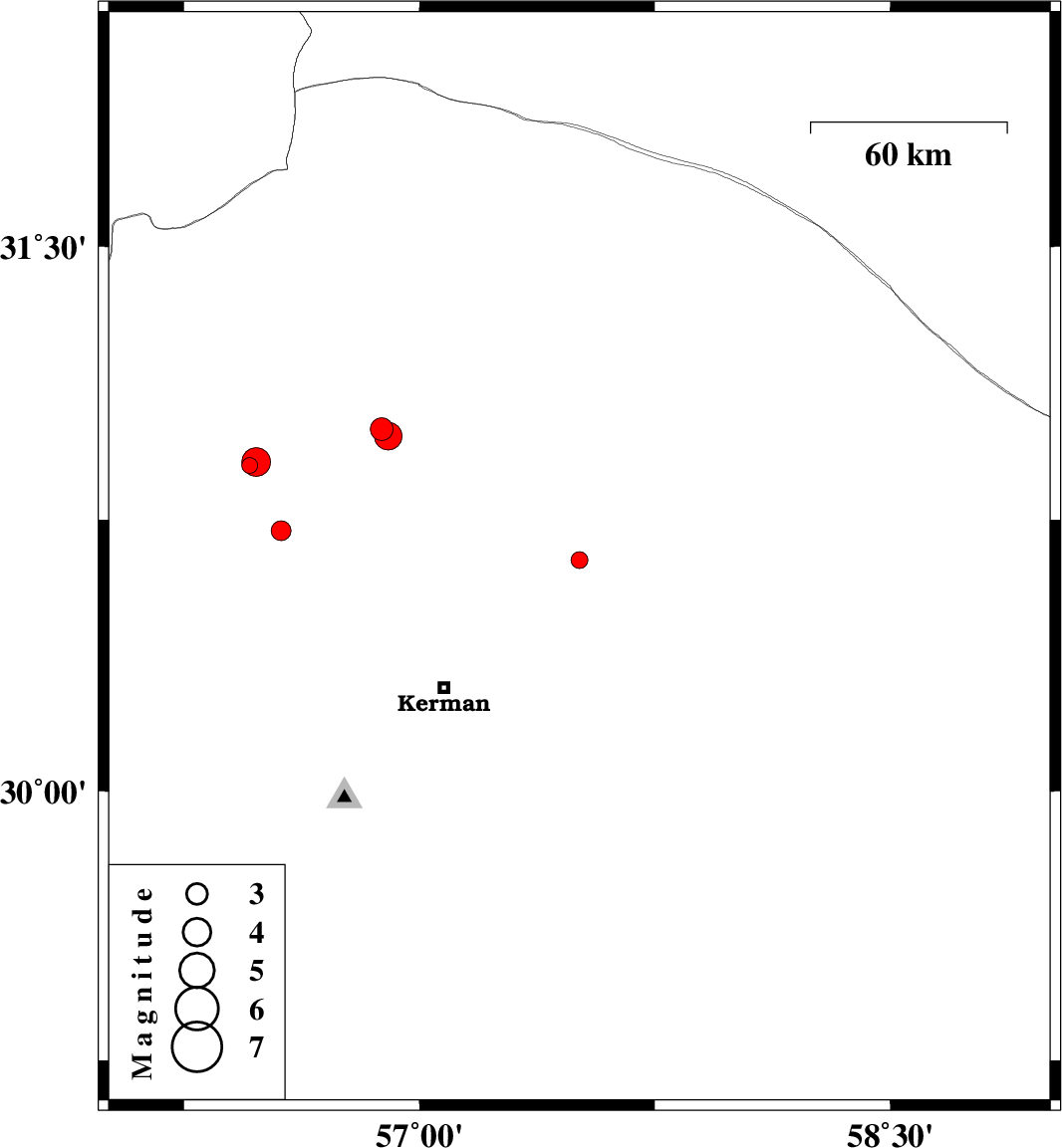 2014/04/11 | 23:36:13.3 | 04:06:13.3 | 30.98 | 56.9 | 14 | ML:4 | Kerman Province, 33 km South of Ravar | ||
