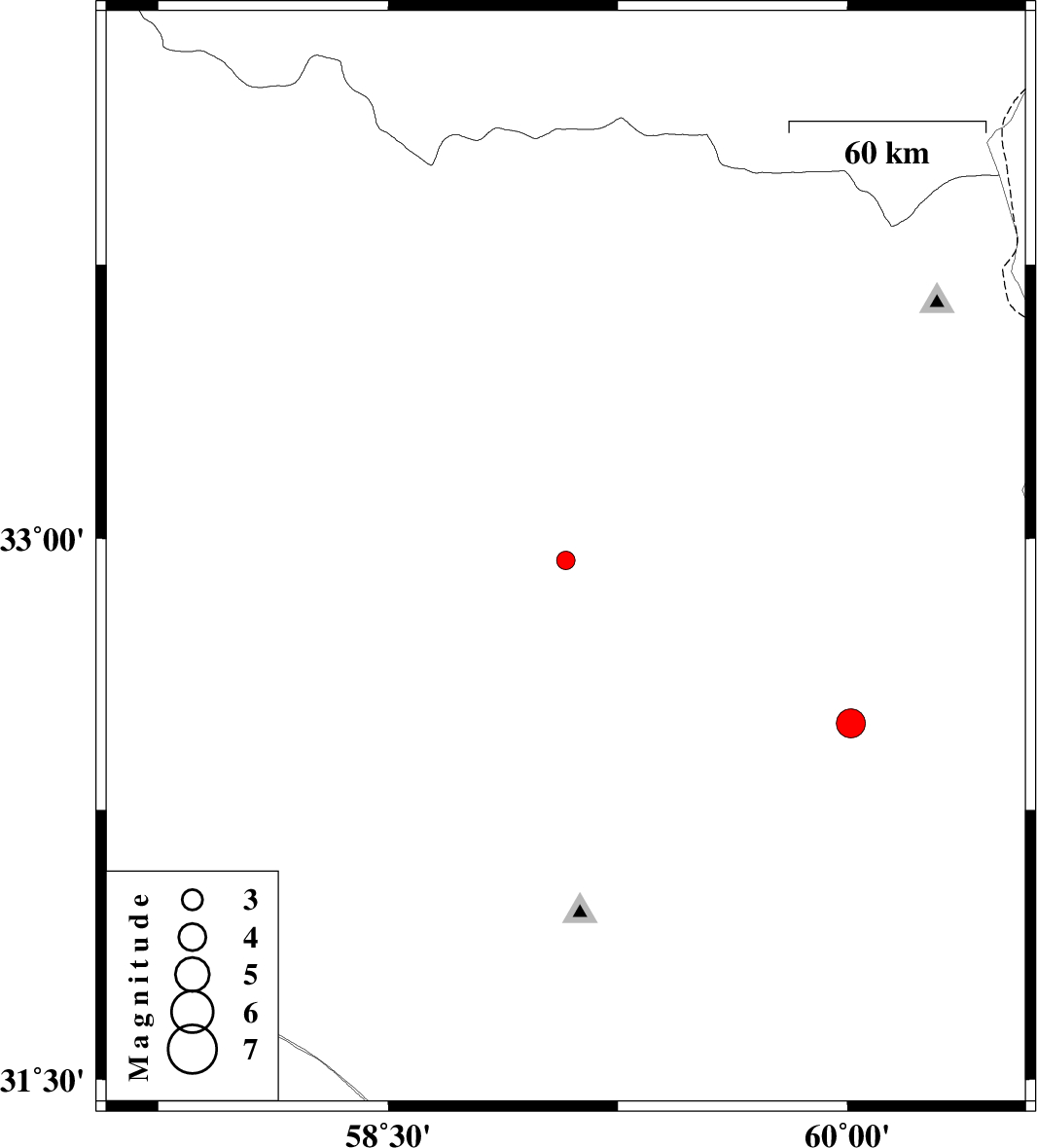 2014/04/14 | 02:28:47.7 | 06:58:47.7 | 32.94 | 59.08 | 14 | ML:2.7 | Khorasan(south) Province, 15 km West of Birjand | ||