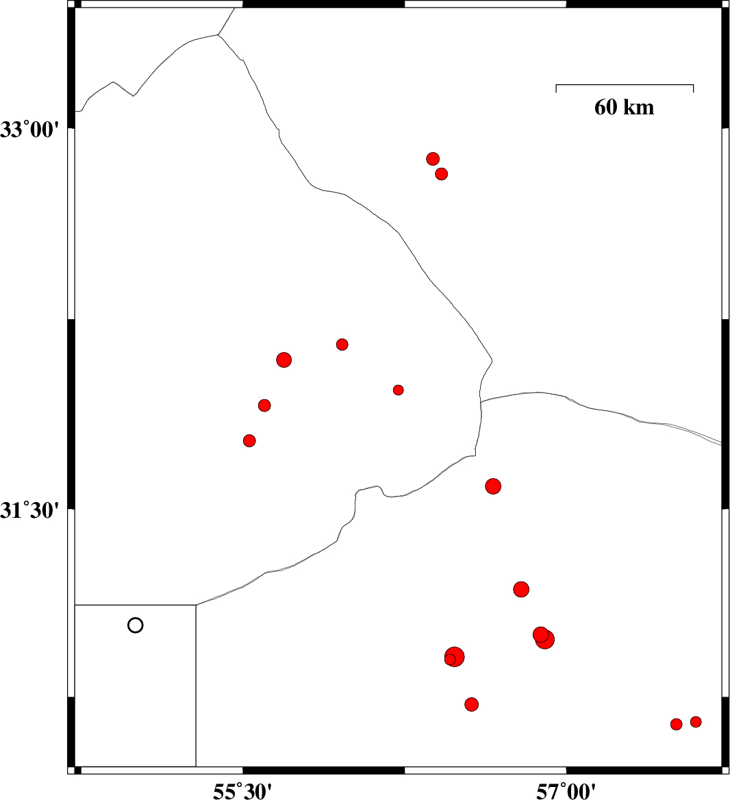 2014/04/11 | 23:36:13.3 | 04:06:13.3 | 30.98 | 56.9 | 14 | ML:4 | Kerman Province, 33 km South of Ravar | ||