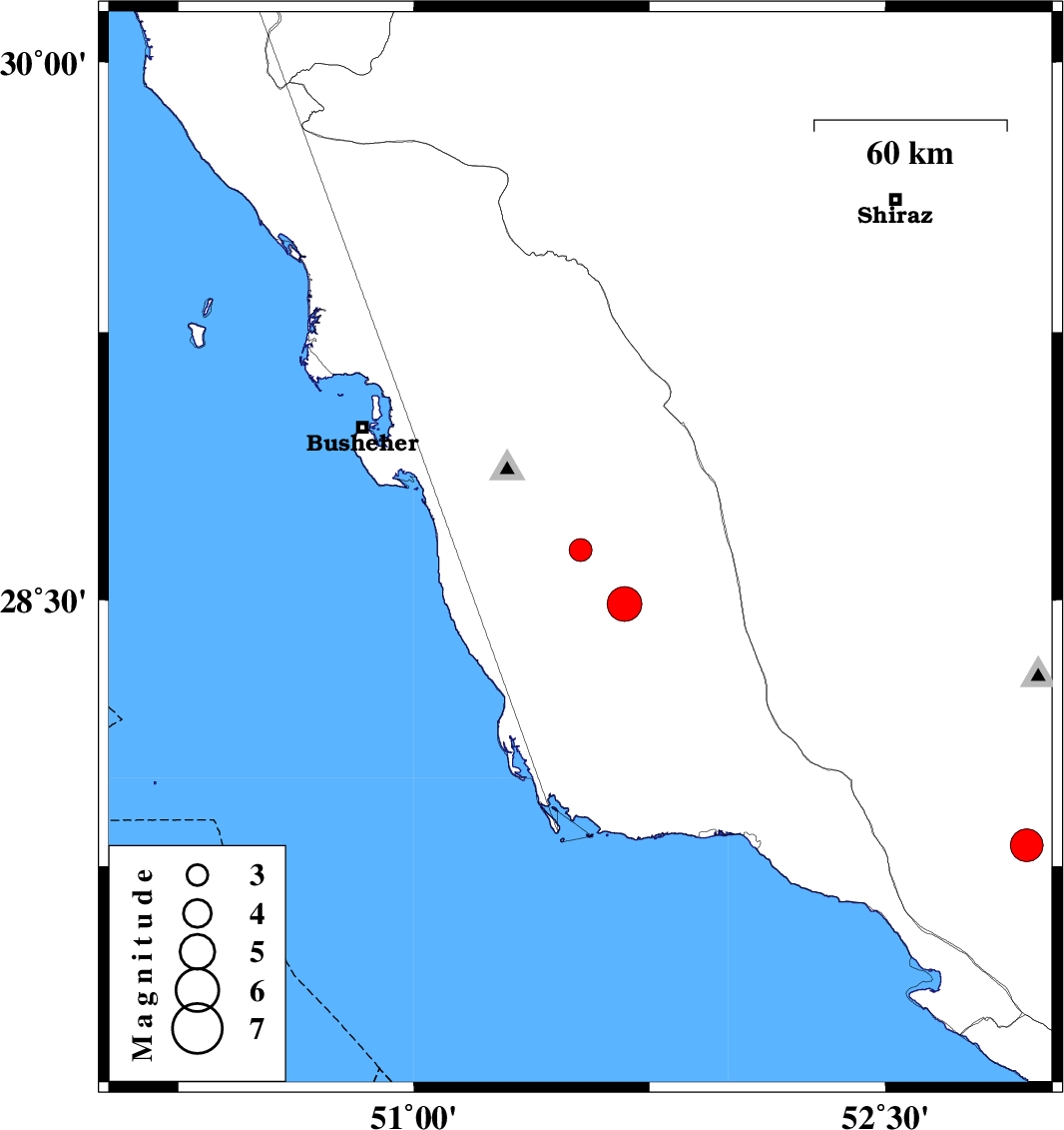 2014/04/17 | 01:12:22.8 | 05:42:22.8 | 28.64 | 51.53 | 24 | ML:3.3 | Bushehr Province, 15 km East of Khormog | ||
