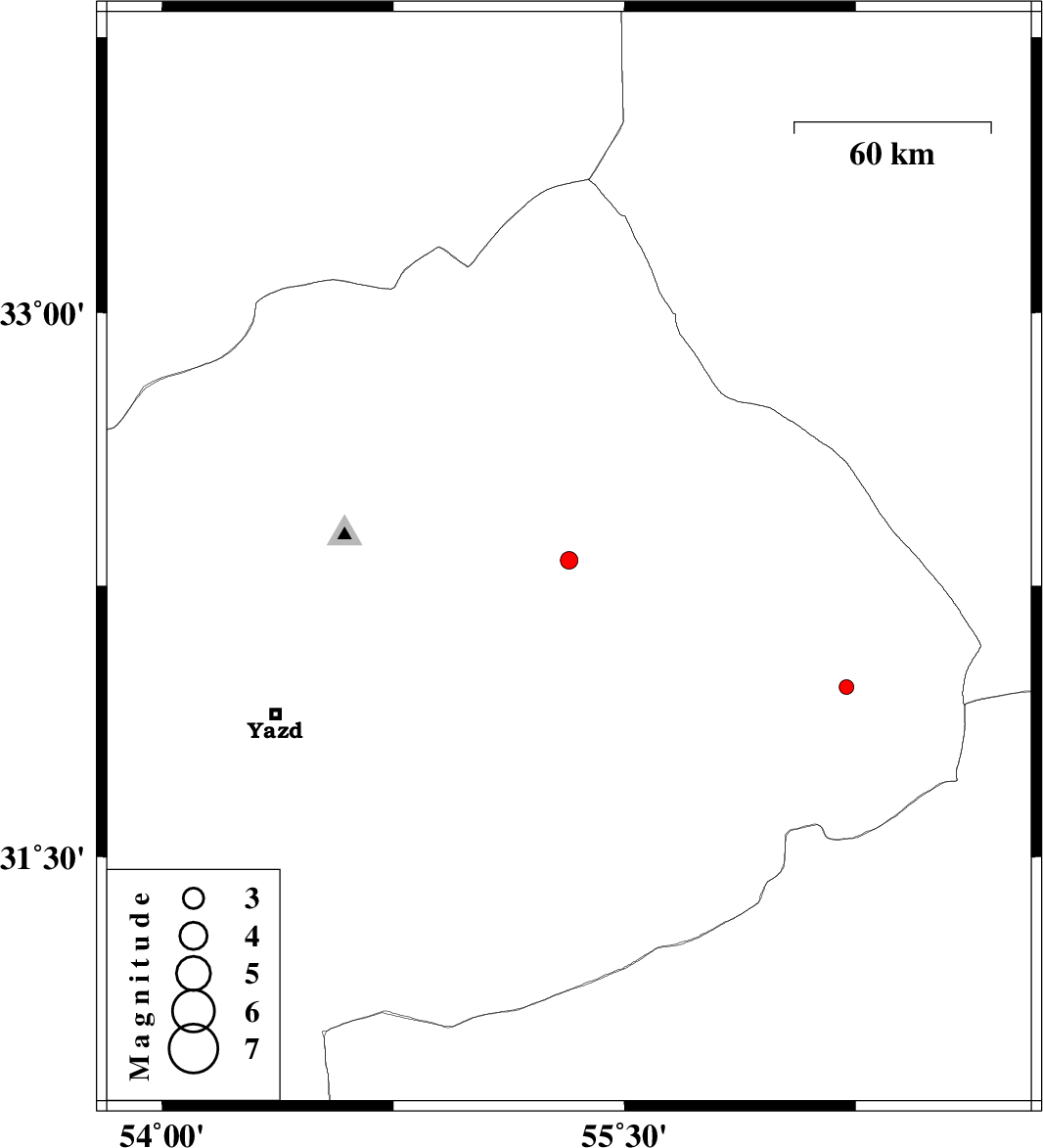 | 2014/04/15 | 02:04:59.9 | 06:34:59.9 | 31.97 | 56.22 | 34 | ML:2.1 | Yazd Province, 88 km North-East of Bafq |