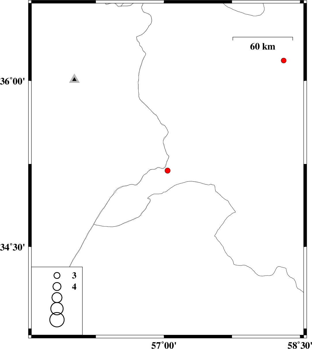 2014/04/01 | 02:58:42.6 | 07:28:42.6 | 36.18 | 58.32 | 15 | ML:2.5 | Khorasan(center) Province, 43 km West of Neyshabur |