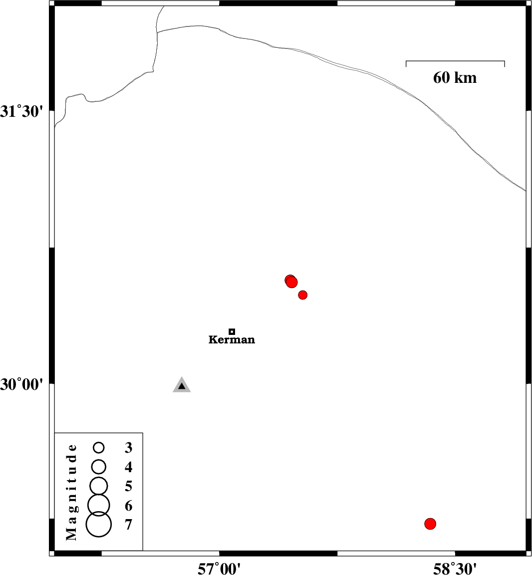 2014/04/23 | 11:15:41.9 | 15:45:41.9 | 30.57 | 57.45 | 14 | ML:2.8 | Kerman Province, 47 km North-East of Kerman |