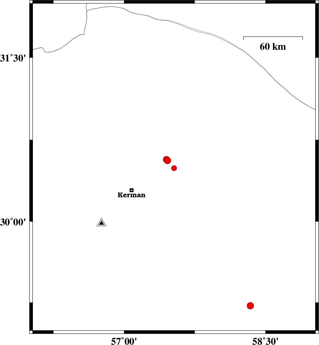 2014/04/23 | 20:00:49.3 | 00:30:49.3 | 29.22 | 58.34 | 14 | ML:3.2 | Kerman Province, 13 km North of Bam | ||