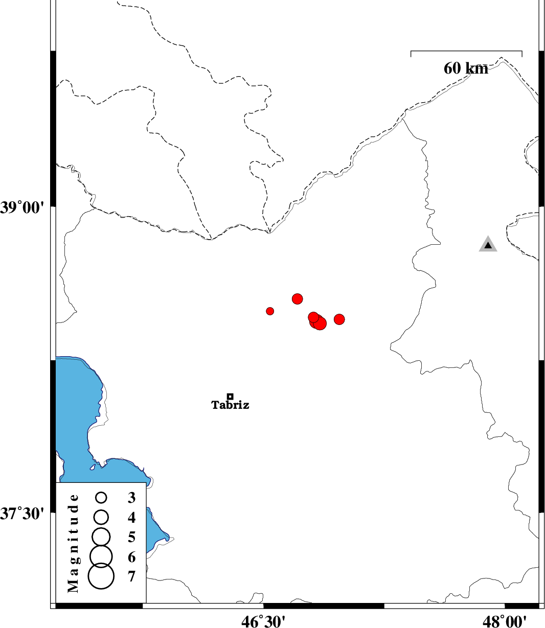2014/04/13 | 02:45:06.8 | 07:15:06.8 | 38.46 | 46.81 | 15 | ML:3 | Azarbaijan Sharghi Province, 23 km West of Ahar | ||
